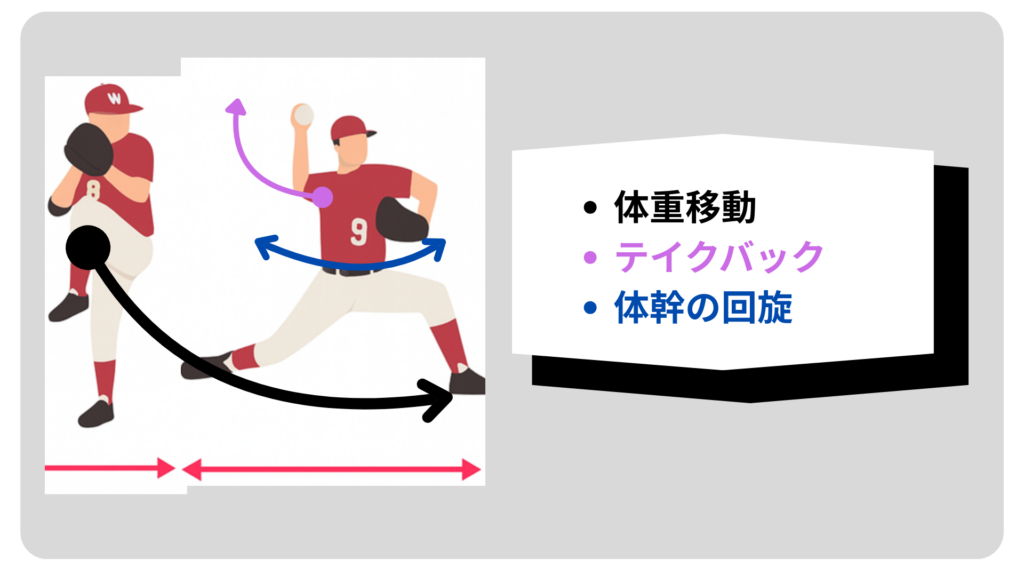 内野手のように軸足がすぐ流れないよう、軸足に乗せてから前へ移動します。 - ②テイクバックを大きくし、しなりを使える形に整えること。